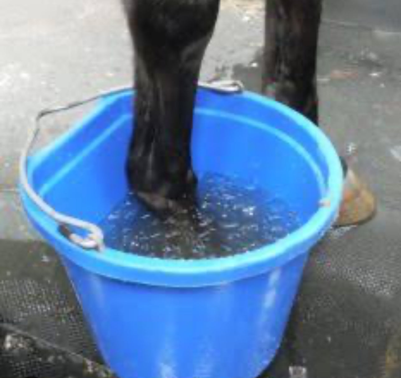 Soak the hoof up to the coronet band for at least 10 minutes, or as long as the horse will allow.