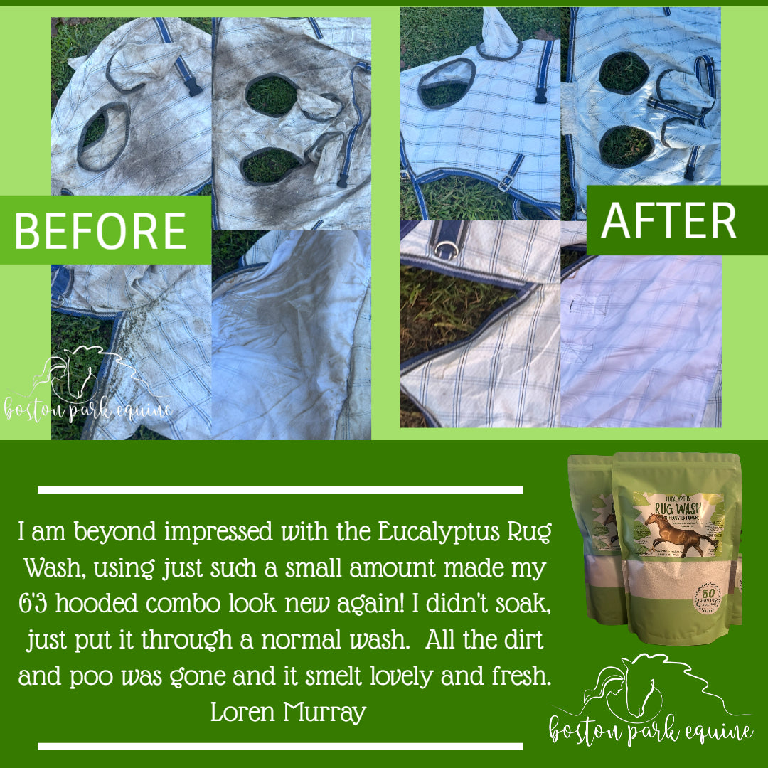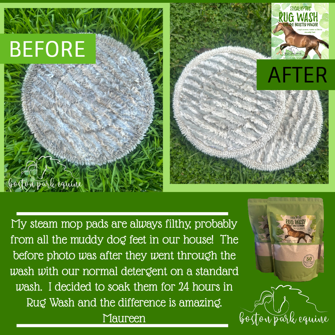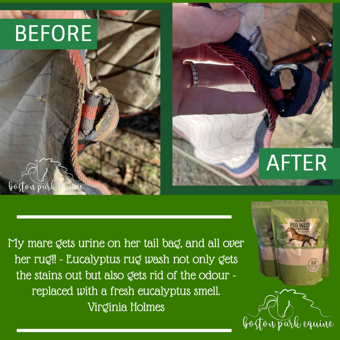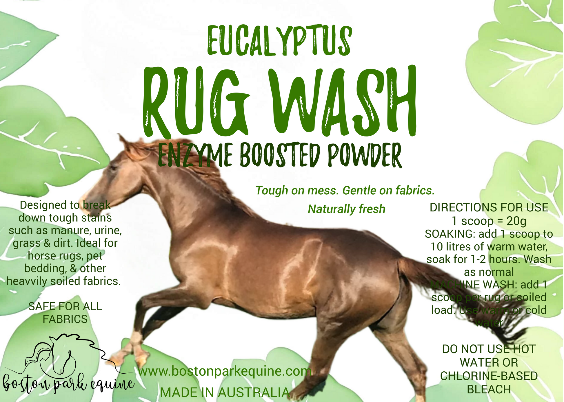 Eucalyptus Rug Wash is a powerful enzyme boosted powder specially formulated to break down stubborn protein stains like manure, urine, grass, and dirt. Designed for use on horse rugs, dog bedding, kennel mats, and other animal and environmental soiled fabrics, it targets the messiest jobs while being safe on materials.